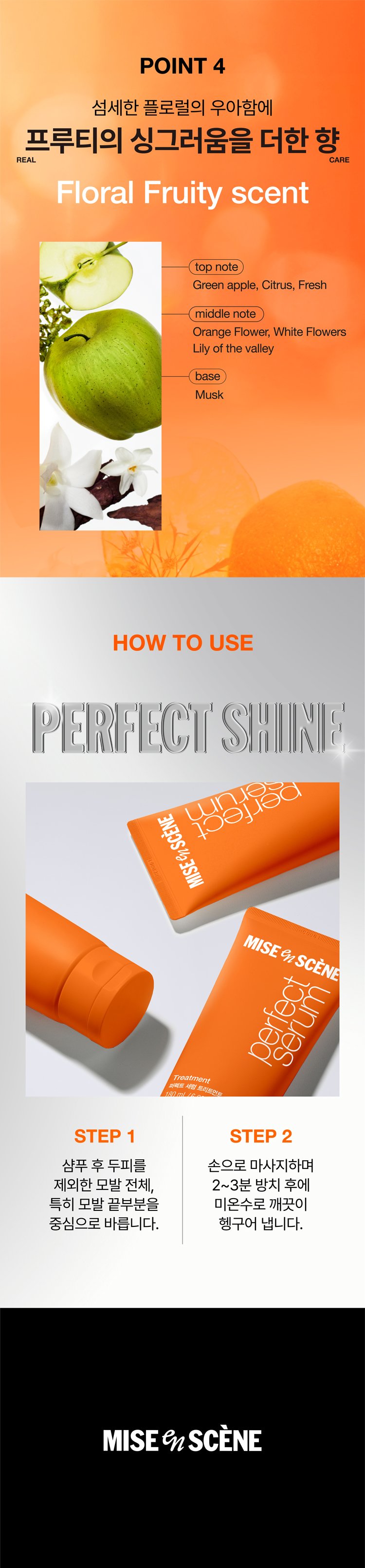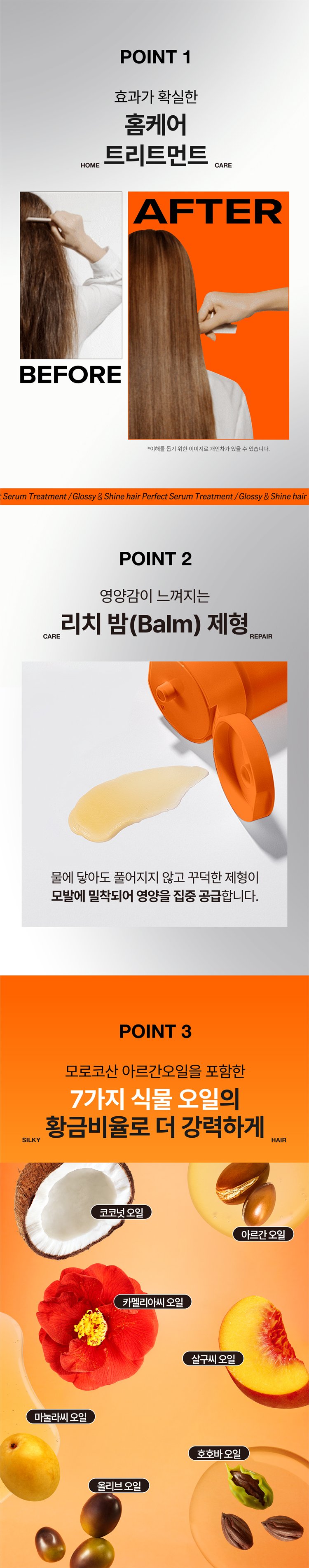 정제수, 세테아릴알코올, 솔비톨, 다이메티콘, 다이프로필렌글라이콜, 베헨트라이모늄클로라이드, 하이드로제네이티드폴리아이소부텐, 아모다이메티콘, 향료, 아이소프로필알코올, 카프릴릴글라이콜, 락틱애씨드, 트라이데세스-10, 다이소듐이디티에이, 1,2-헥산다이올, 에틸헥실글리세린, 리모넨, 아르간커넬오일, 호호바씨오일, 코코넛야자오일, 황색5호, 황색4호, 살구씨오일, 올리브오일, 마룰라씨오일, 동백나무씨오일, 코코-카프릴레이트/카프레이트, 토코페롤, 글라이코리피드