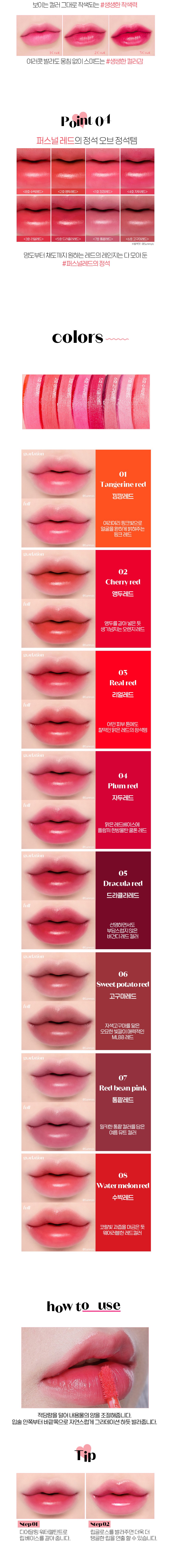정제수, 글리세린, 글리세릴폴리메타크릴레이트, 프로판다이올, 트레할로오스, 펜틸렌글라이콜, 1,2 혜산다이을, 암모늄아크릴로일다이메틸타우레이트/브이피코폴리머, 황색5호, 폴리아크릴레이트-13, 폴리아이소부텐, 적색227호, 트로메타민, 글리세릴카프릴레이트, 폴리글리세릴-10라우레이트, 향료, 적색218호, 부틸렌글라이콜, 폴리솔 베이트20, 솔비탄아이소스테아레이트, 석류추출물, 트리리프솝베리열매추출물